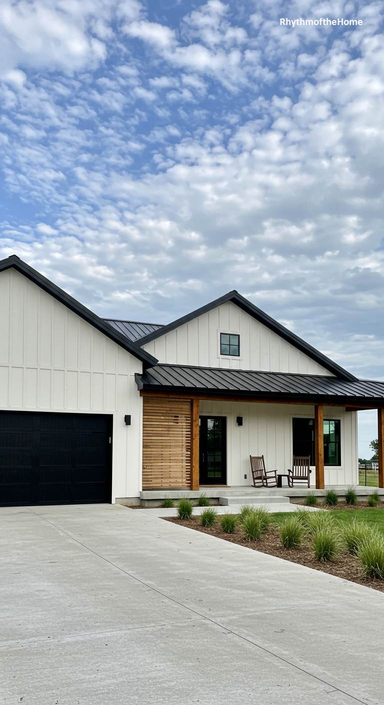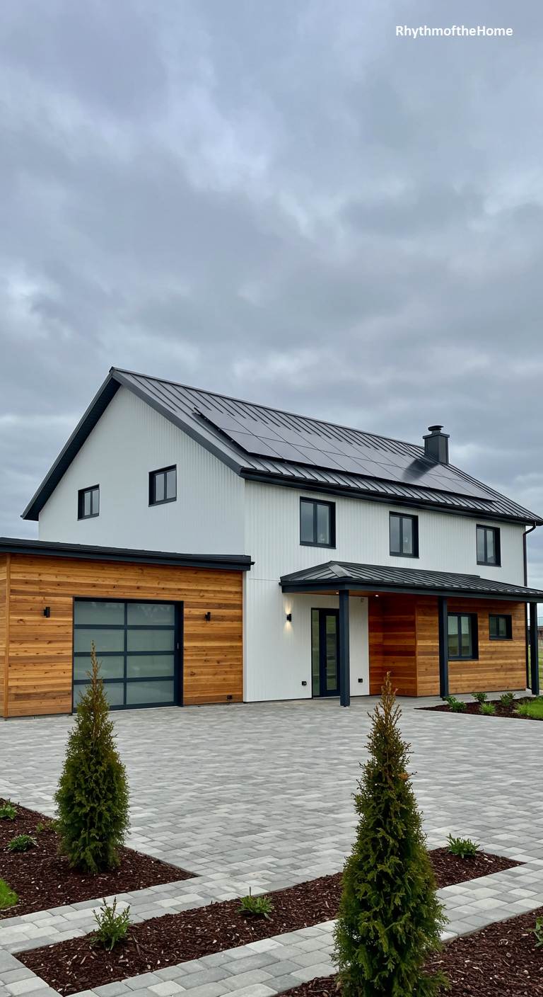 This contemporary barndominium showcases a stylish and textured mix of materials. The main body of the house features clean white siding, which is beautifully contrasted with sections of warm, horizontal cedar siding on the front of the garage and around the entryway. A black metal roof and black trim tie the whole design together. The paved driveway and small evergreen trees add to the clean, modern aesthetic. This home feels fresh, modern, and thoughtfully designed, with a great balance of different colors and textures.