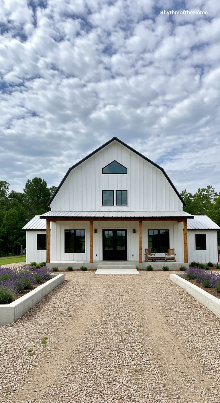 This barndominium beautifully reinterprets the traditional gambrel barn silhouette for contemporary tastes. Its clean white vertical siding and dark metal roof create a striking profile against a backdrop of green trees. The symmetrical facade is centered around a large double glass door, with a distinctive triangle window above it in the gambrel peak. The full-width covered porch is supported by simple, sturdy wooden posts. A gravel driveway and neatly planted lavender beds lead to the entrance, creating a look that is both refreshingly modern and respectfully classic.
