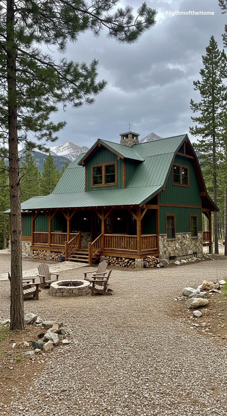 Nestled amidst towering pines with majestic snow-capped mountains in the distance, this barndominium is the ultimate mountain retreat. Its deep green siding and matching metal roof allow it to blend harmoniously with the natural surroundings. A gambrel roofline and a substantial stone-clad chimney add to its rustic cabin feel. The expansive wooden porch, complete with sturdy railings, invites outdoor relaxation, while a gravel yard features a cozy fire pit surrounded by Adirondack chairs. This home is a sanctuary of tranquility, offering a rugged yet comfortable escape from the everyday world.