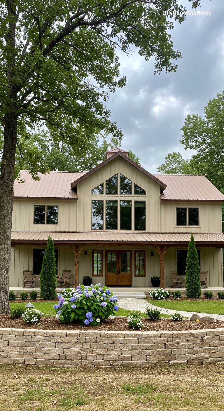 This barndominium boasts a sophisticated and warm contemporary design. The tan vertical siding provides a soft, neutral base that is beautifully complemented by a bronze-colored metal roof and dark trim. A large bank of windows above the double front doors floods the interior with natural light and creates a stunning architectural feature. The covered porch is supported by simple wooden posts, and the landscaping is elegant, featuring a curved stone retaining wall and a large hydrangea bush. This home exudes a quiet, understated luxury and a strong connection to its beautifully manicured surroundings.