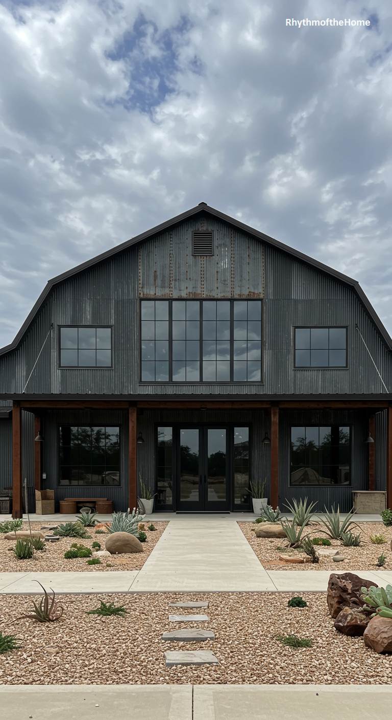 This barndominium embraces an edgy, industrial aesthetic with its corrugated metal siding. The weathered, galvanized finish of the siding gives it a raw and rustic texture, which is contrasted by the clean lines of the large, black-framed windows that dominate the central section. The porch roof is supported by simple, dark posts, maintaining the minimalist, functional look. The landscaping is equally understated, featuring gravel, rocks, and drought-tolerant agave plants. This is a bold and stylish home that celebrates industrial materials and modern design in a rugged, desert-like setting.