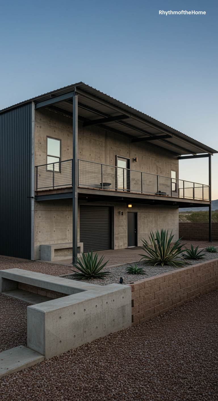 This barndominium is a striking example of minimalist industrial architecture. The main structure is formed from raw, board-formed concrete, showcasing the texture and pattern of the wooden molds. A sleek, dark metal roof and siding on the upper level provide a sharp contrast. A second-story balcony with a simple wire mesh railing runs the length of the building, supported by steel posts. The landscaping is stark and modern, featuring concrete benches, gravel, and resilient agave plants. This home is a bold statement of modernist design, emphasizing raw materials and clean, functional forms.