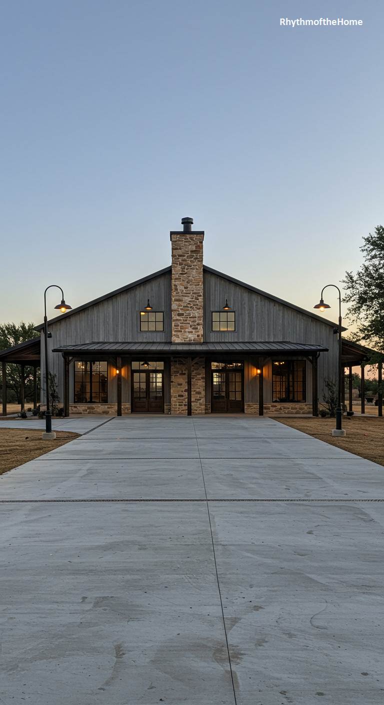 Exuding a sense of balanced and timeless elegance, this barndominium is perfectly symmetrical. The exterior is clad in weathered grey wood siding, with a formidable stone-clad chimney and entrance forming the central axis. Two sets of glass double doors are flanked by large windows, creating a welcoming and open facade. As dusk falls, warm interior lights and exterior sconces cast a golden glow, enhancing the inviting atmosphere. A wide concrete driveway leads straight to the entrance, reinforcing the design’s formal symmetry and creating a grand yet approachable feel.