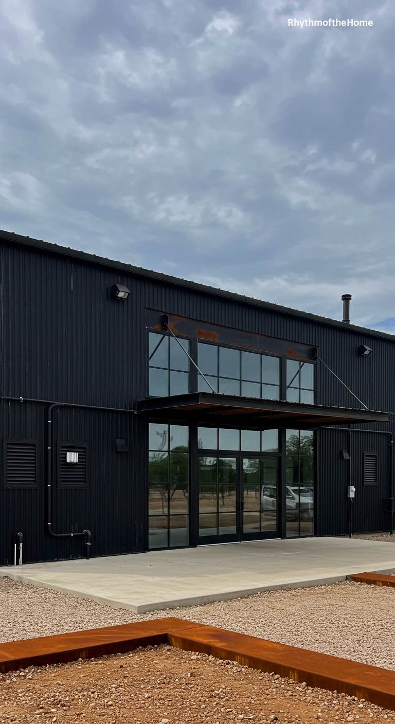 This barndominium presents a sleek and powerful industrial design. The building is clad in black corrugated metal, giving it a modern and utilitarian look. The entrance is defined by a large bank of windows set within a frame that shows a hint of rust, adding a touch of weathered, industrial character. The simple concrete porch and gravel landscaping maintain the minimalist aesthetic. This is a no-nonsense, high-impact design that speaks to a love of clean lines, functional forms, and the bold beauty of industrial materials.