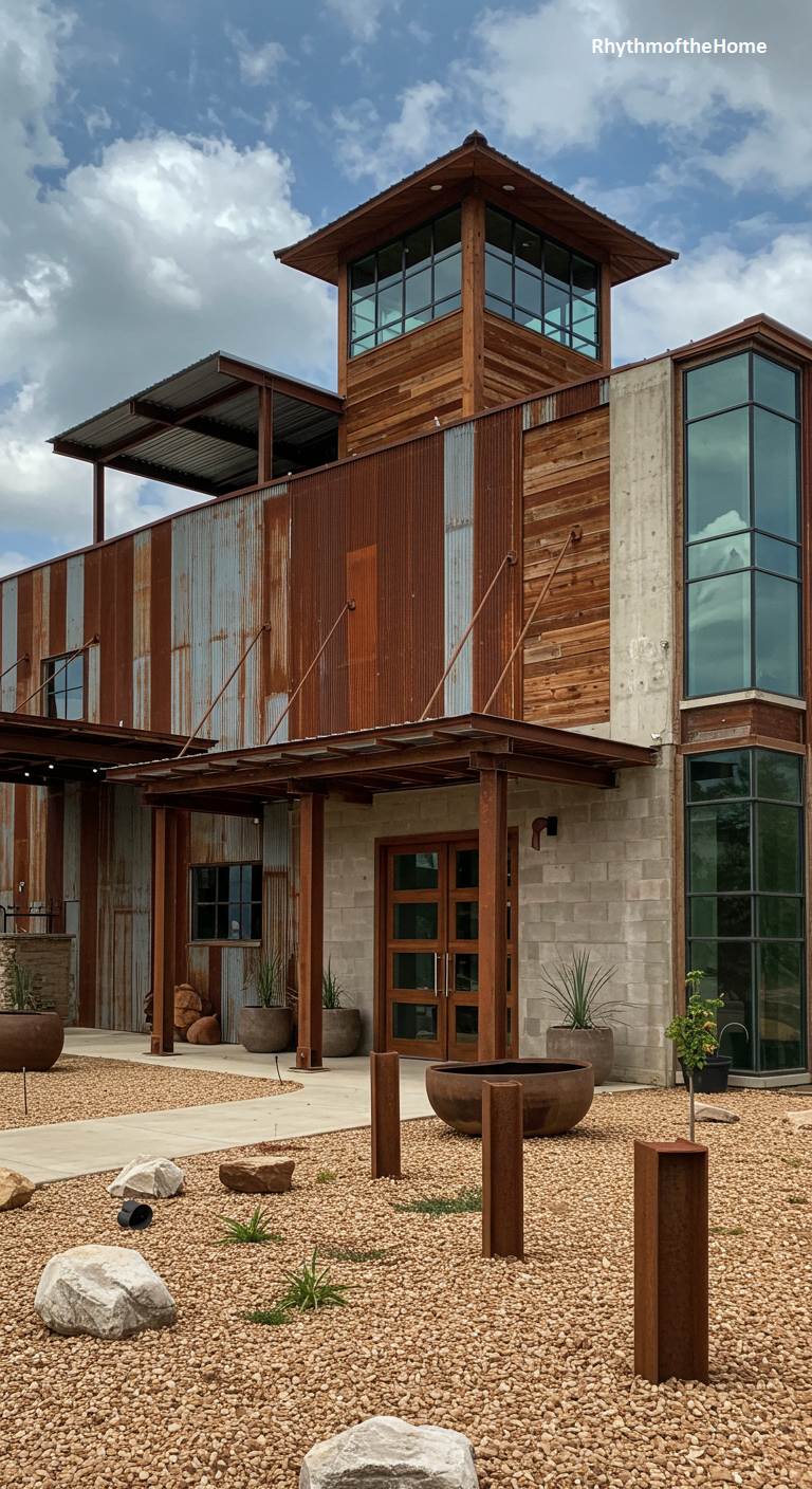 A fascinating mix of materials gives this barndominium a unique and eclectic modern identity. The structure combines sections of smooth concrete, weathered corrugated steel, and warm reclaimed wood siding, creating a rich tapestry of textures and colors. A prominent glass-walled section creates a light-filled corner, while a tower-like element adds verticality. The landscaping is organic and sculptural, with large, rustic planters and irregularly placed stones. This is a highly creative and artistic home that feels like a functional piece of modern sculpture.