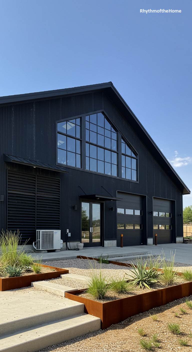 This striking barndominium makes a bold statement with its all-black corrugated metal exterior and roof. The dark, monolithic form is punctuated by a massive, multi-paned window section that follows the gable of the roof, creating a dramatic architectural feature. Two modern garage doors and a glass entry door are neatly integrated into the facade. The landscaping is minimalist and modern, with concrete walkways, rusted steel planters, and drought-tolerant grasses. This home has a commanding presence, blending industrial materials with a sharp, contemporary design sensibility.