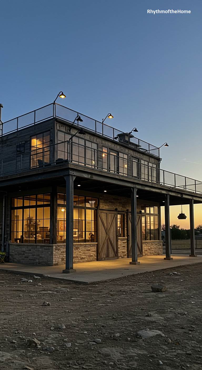 This two-story barndominium evokes the feel of a spacious industrial loft. The structure is built with a visible steel I-beam frame, giving it an authentic industrial skeleton. The lower level features stone accents and large windows, while the upper level is clad in weathered wood. A full-length second-story balcony with a simple railing provides an expansive outdoor living space. As evening approaches, the interior lights create a warm and inviting glow, showcasing the living spaces within. This is a stylish and rugged home that perfectly captures the open, airy feel of loft-style living.