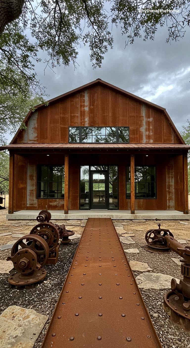 This barndominium has a unique and powerful aesthetic, defined by its rusted corrugated steel siding. The warm, earthy tones of the weathered steel give the home a beautiful, organic patina that feels both industrial and natural. A simple covered porch is supported by wooden posts, and the large, dark-framed windows provide a modern contrast. A rusted steel walkway leads to the front door, unifying the design. The yard is decorated with antique, rusty mechanical parts, further enhancing the home’s distinctive, artfully weathered character.