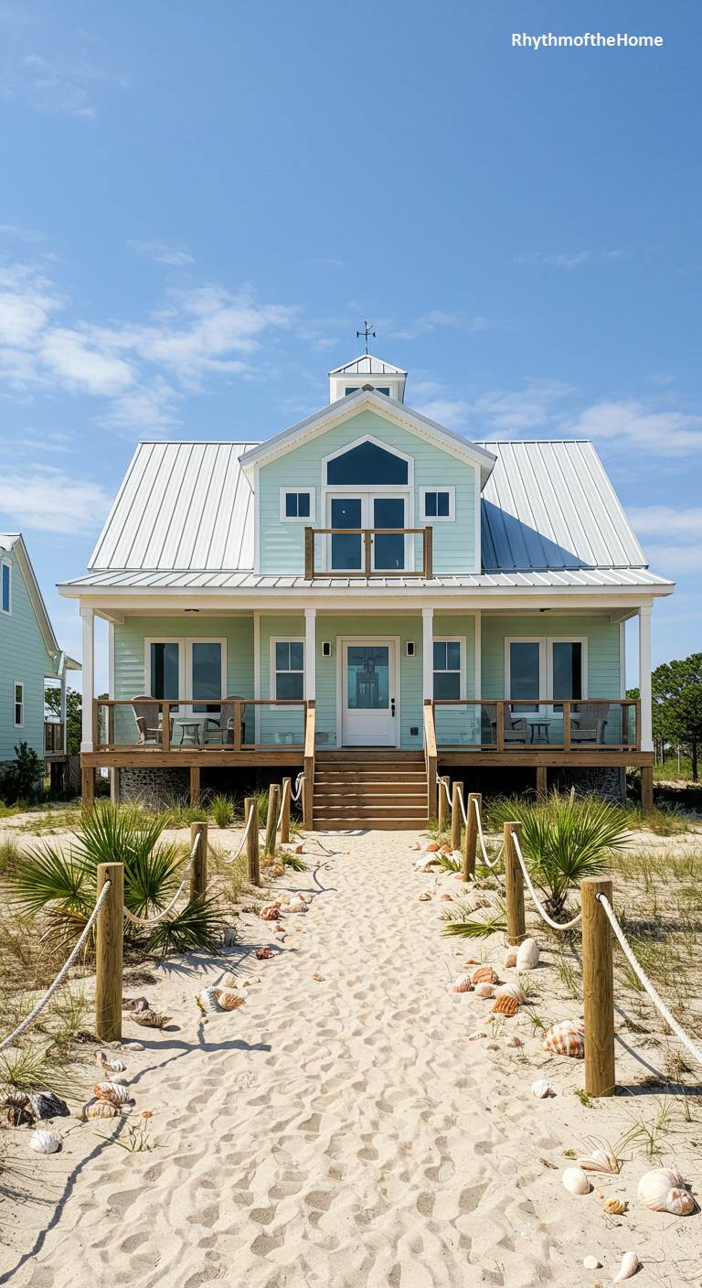 This charming barndominium captures the breezy, relaxed spirit of coastal living. Painted in a soft, seafoam green with a crisp white metal roof and trim, it radiates a light and airy feel. The home is elevated on piers, a practical and traditional feature for beachfront properties, creating a spacious covered area underneath. A wide, welcoming front porch looks out over the dunes. The pathway to the front door is a simple sandy trail bordered by rustic wooden posts, rope, and a collection of seashells, perfectly setting the scene for a life lived by the rhythm of the tides.