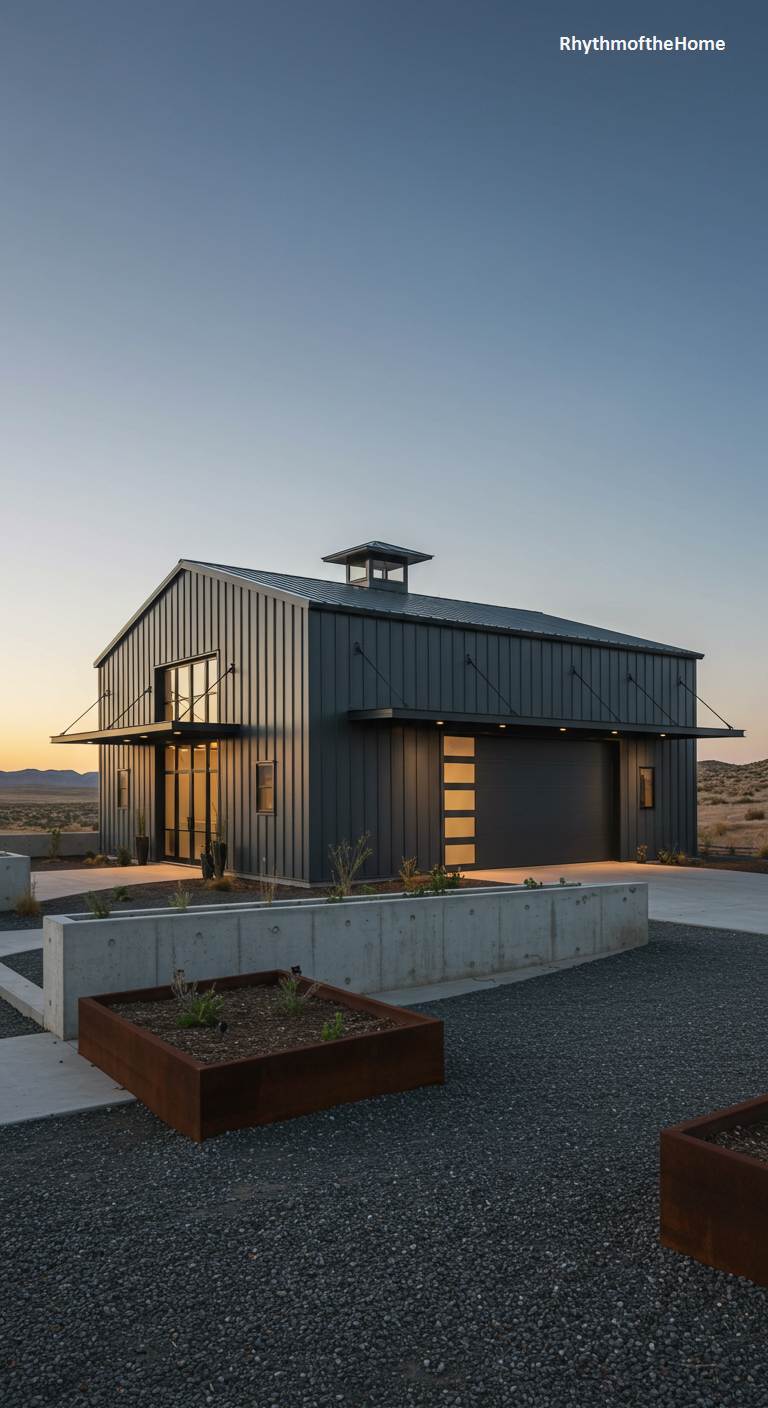 This barndominium is a stunning example of modern architecture designed for a desert environment. Its simple, barn-like form is clad in dark grey standing-seam metal, giving it a sleek and durable finish. A large garage door with frosted glass panels and a covered entryway provide functional access. The most striking features are the large metal awnings, which can be extended to provide shade from the harsh sun. The landscaping is minimalist and drought-tolerant, featuring concrete retaining walls and gravel beds. This is a sophisticated and practical home, perfectly suited to its surroundings.