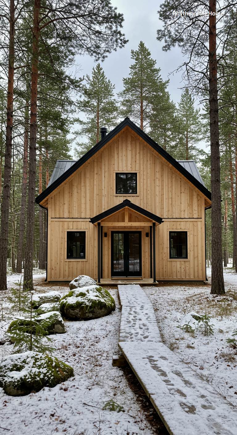 Nestled among tall pine trees, this barndominium is the quintessential modern forest cabin. The exterior is clad in light, natural vertical wood siding, allowing it to blend beautifully with its wooded setting. The black metal roof and black window frames provide a crisp, contemporary contrast. A simple wooden walkway on a snowy path leads to the sheltered front entrance. The design is clean, simple, and respectful of its environment, offering a peaceful and stylish sanctuary for anyone looking to connect with nature.