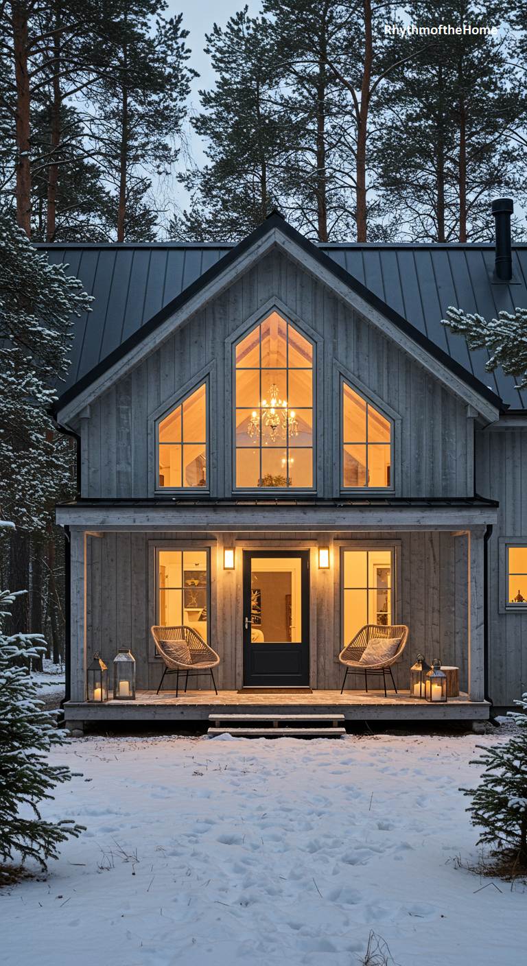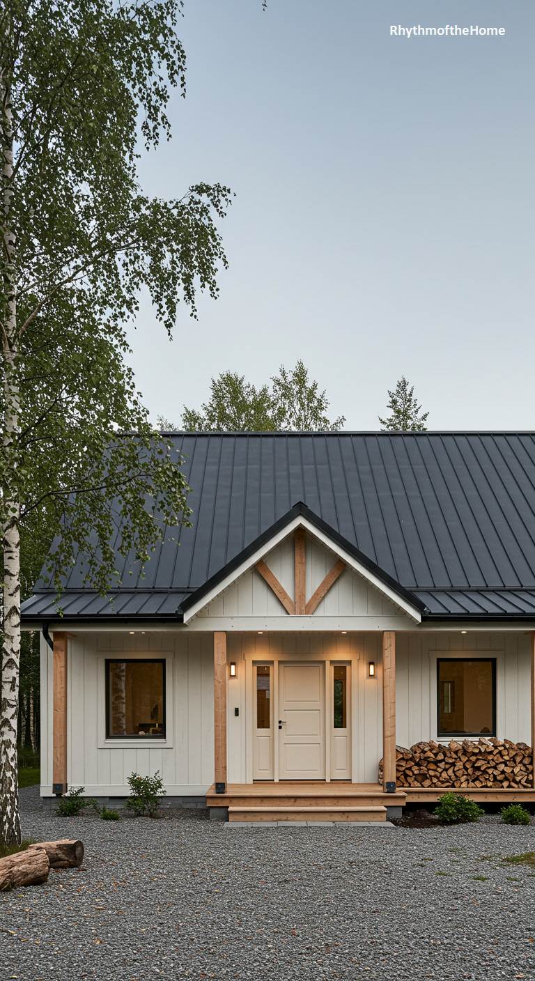 This home perfectly captures the essence of Scandinavian farmhouse style. It features clean white siding and a dark standing-seam metal roof, a classic combination that feels both fresh and timeless. The gabled entryway is accented with simple timber framing, and the porch is supported by natural wood posts. A neatly stacked pile of firewood on the porch adds a touch of rustic authenticity. Set against a backdrop of green trees with a birch in the foreground, this barndominium exudes a sense of calm, cozy simplicity and understated elegance.