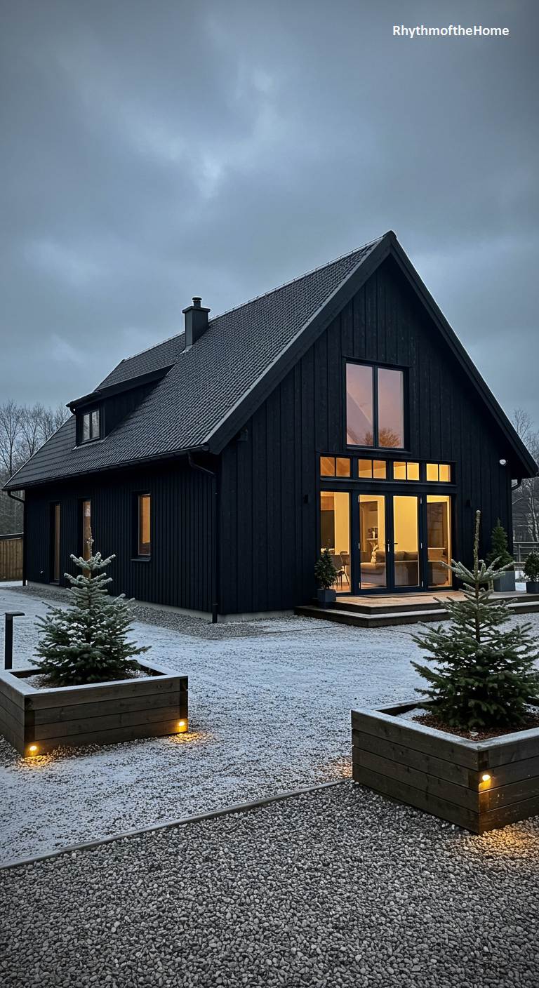 This striking barndominium makes a dramatic statement with its bold, all-black exterior. The dark vertical siding and tiled roof create a sleek, contemporary silhouette against the muted evening sky. Large glass doors and windows allow the warm interior light to spill out, creating a beautiful contrast and a sense of invitation. The landscaping is minimalist and modern, with gravel ground cover and two small Christmas trees in simple wooden planters, adding a touch of festive warmth. This is a sophisticated and modern home with a powerful and memorable presence.