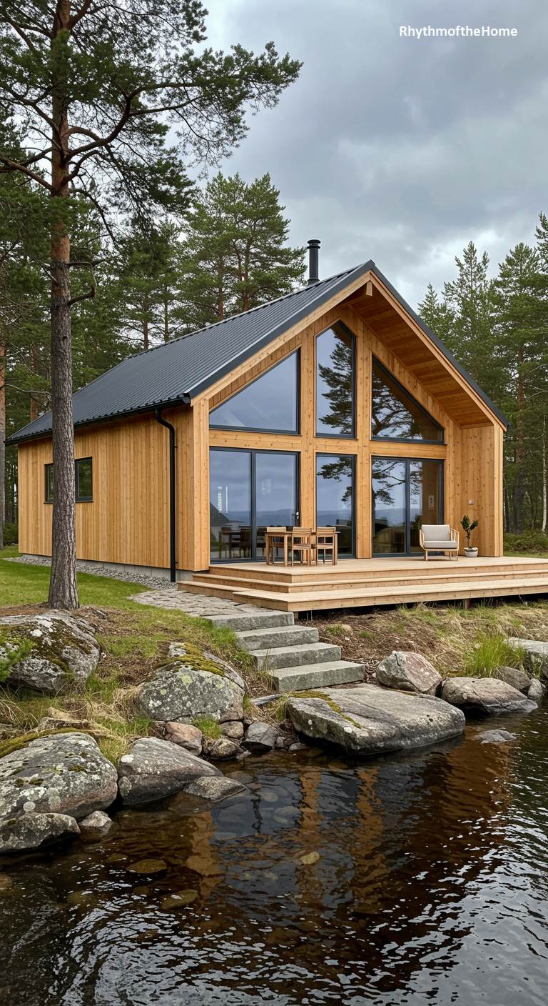 This stunning barndominium features a dramatic wall of glass that embraces its beautiful lakeside setting. The A-frame style gable is almost entirely filled with windows, blurring the line between the cozy interior and the natural world outside. The natural wood siding warms the modern design, while the black metal roof provides a sleek finish. A spacious wooden deck extends towards the water, providing the perfect platform for relaxing and soaking in the tranquil views. This is a dream home for nature lovers, designed to maximize light, views, and a connection to the serene landscape.