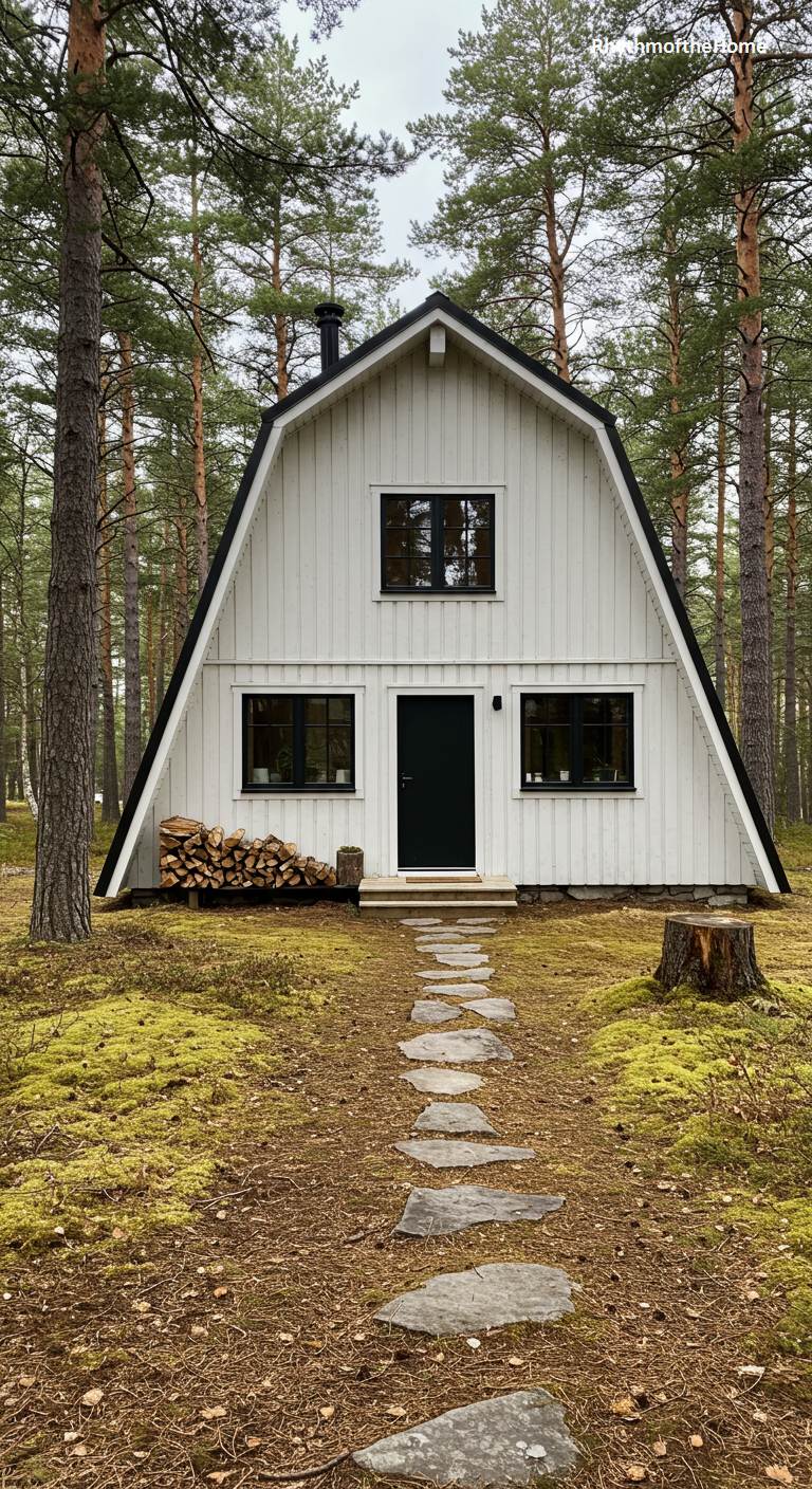 This charming A-frame barndominium looks like it was plucked from the pages of a fairytale. Its steep, triangular roofline is clad in dark metal, contrasting beautifully with the white vertical siding. Nestled in a mossy pine forest, the home feels cozy and secluded. A rustic flagstone path winds through the forest floor to the dark front door. A neatly stacked pile of firewood hints at cozy evenings by the fire. This is a wonderfully romantic and picturesque retreat, offering a unique and whimsical approach to cabin living.