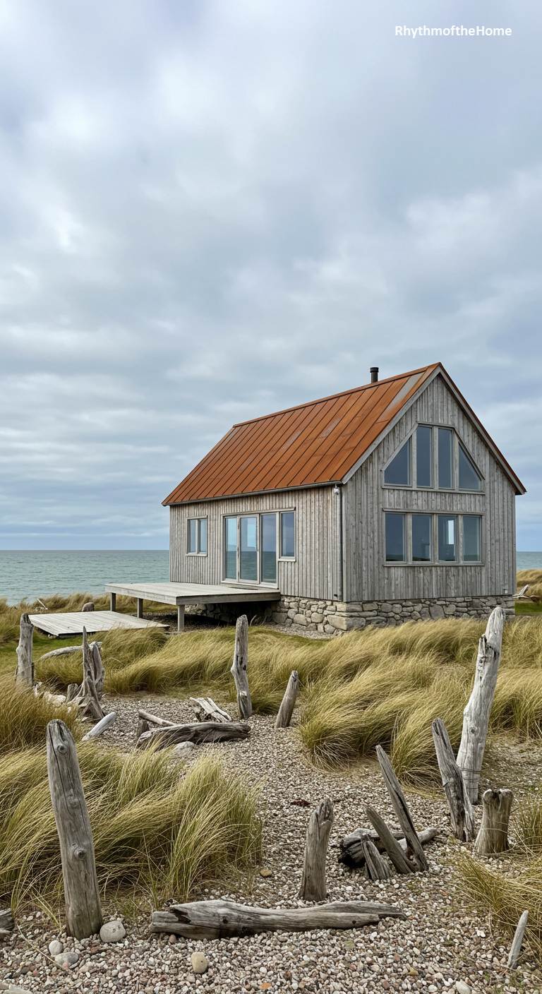 Set amidst windswept coastal grasses, this barndominium has a raw, natural beauty that perfectly complements its seaside location. The weathered grey wood siding and rusted metal roof look as though they have been shaped by the sea air. A simple wooden deck extends from the side of the house, offering a place to sit and watch the waves. The landscape is wild and untamed, with driftwood scattered among the dunes. This is a home that embraces the rugged beauty of the coast, offering a simple, peaceful retreat from the world.