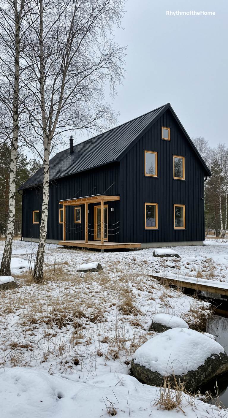 With a striking and bold presence, this barndominium embodies a minimalist Scandinavian design philosophy. The entire structure is clad in black vertical siding with a matching black metal roof, creating a dramatic, monolithic form against the stark winter landscape. The severity of the black is softened by the warm, natural wood used for the window frames and the small, inviting covered entryway. Set amongst bare birch trees in a snowy field, this home is a testament to the beauty of simplicity, proving that modern architectural elegance can feel right at home in a rustic, natural setting.