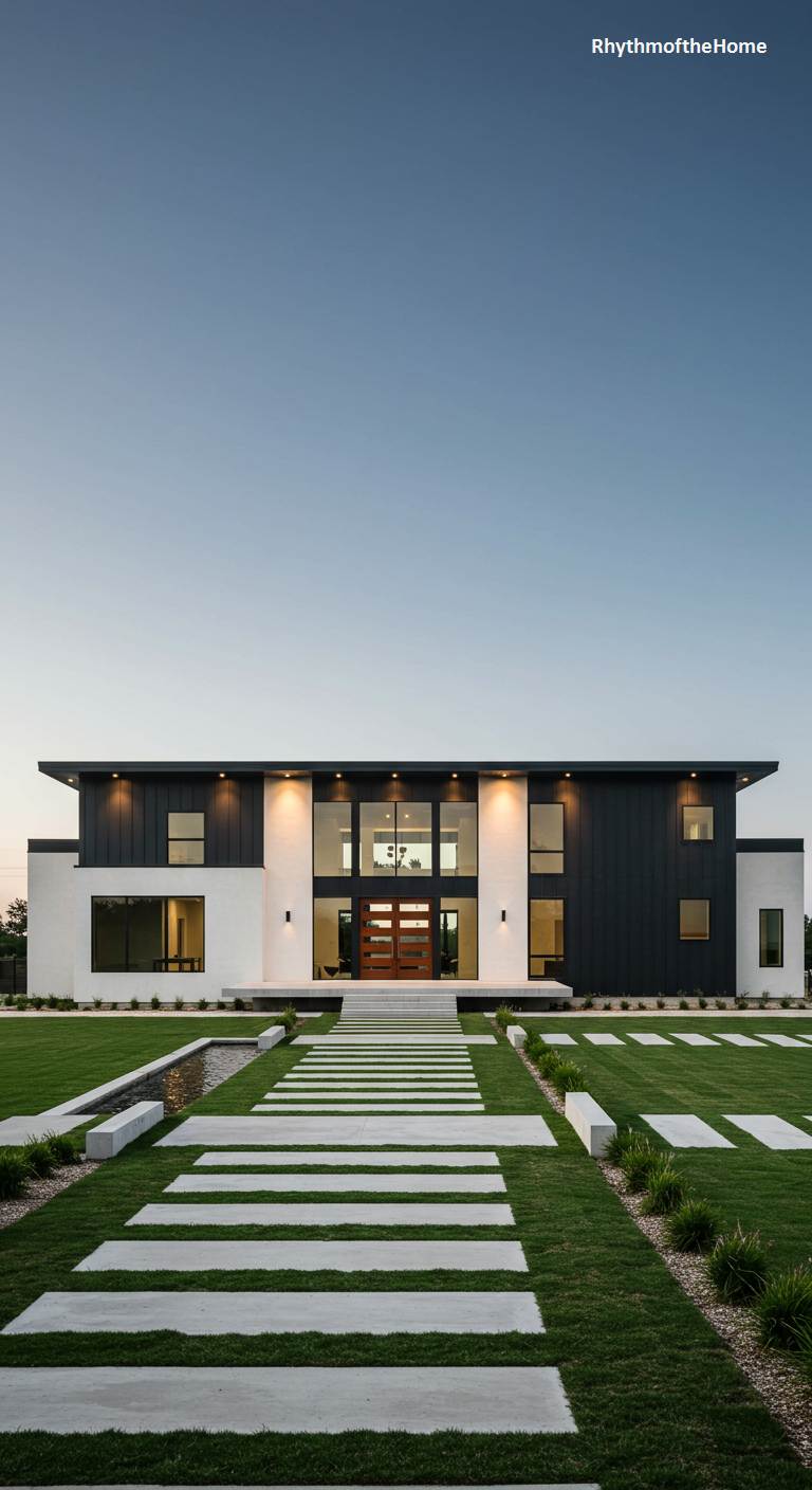 This barndominium is a masterpiece of modern minimalist design. The structure is composed of clean, geometric forms, with brilliant white stucco contrasted by panels of dark vertical siding. A wide, inviting entryway with a warm wood door is set back under a flat roofline. The landscaping is equally minimalist and geometric, with a long reflecting pool and a walkway made of large, separated concrete pavers set into a pristine lawn. This home exudes a sense of calm, order, and sophisticated luxury, making a powerful statement with its clean lines and understated elegance at twilight.