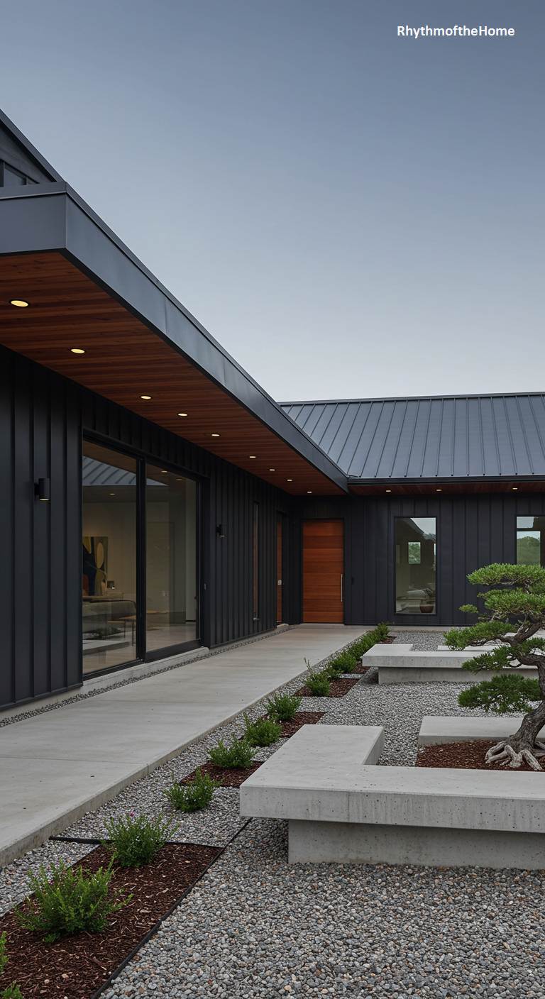 This barndominium showcases a beautiful and tranquil design with clear Japanese influences. The dark vertical siding and low-pitched metal roofs are clean and minimalist. The home forms a courtyard around a serene garden space, featuring carefully placed concrete benches, gravel, mulch, and a stunning bonsai tree. Large sliding glass doors create a seamless connection between the interior living spaces and this peaceful outdoor sanctuary. The design emphasizes natural materials, simplicity, and a deep sense of harmony between the architecture and the landscape.