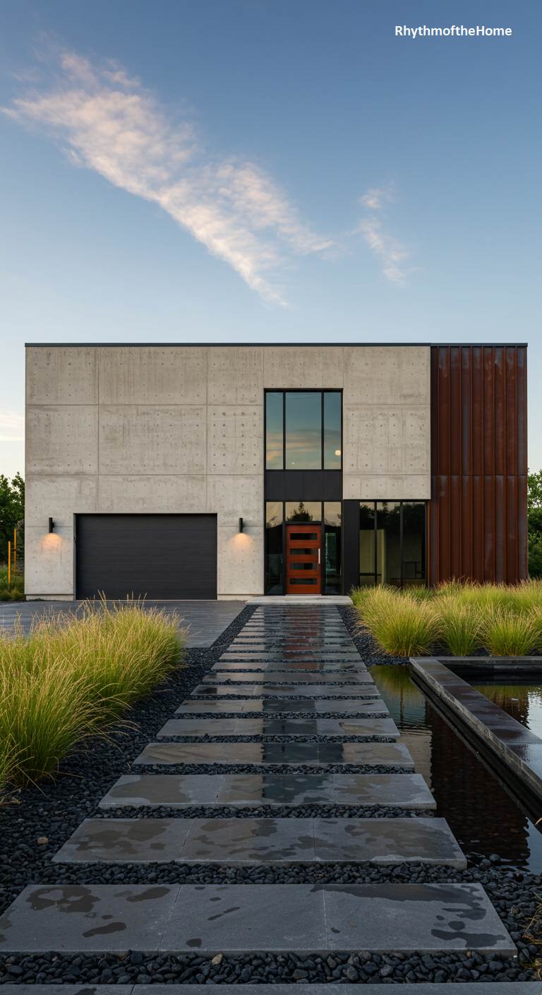 This modern barndominium makes a bold architectural statement with its powerful combination of materials. The main structure features board-formed concrete, giving it a raw, textured, and industrial feel. This is dramatically contrasted with a section of rusted Corten steel siding, which adds a warm, earthy color and a different kind of industrial texture. A sleek glass and dark-framed entryway provides a clean, contemporary touch. The landscaping includes a reflecting pool and a stone paver walkway that appears to float on the water, enhancing the home’s artistic and sculptural quality.