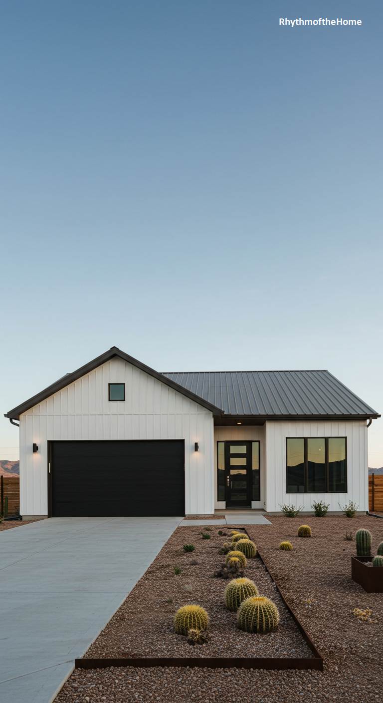 This barndominium perfectly merges the popular modern farmhouse style with a desert-appropriate landscape. The crisp white board-and-batten siding is paired with a dark metal roof and a bold, black garage door for a classic high-contrast look. Instead of a traditional lawn, the landscaping features drought-tolerant gravel and a curated selection of barrel cacti, which is both beautiful and water-wise. This home demonstrates how the clean lines and simple forms of farmhouse architecture can be perfectly adapted to an arid environment, creating a look that is both stylish and sustainable.