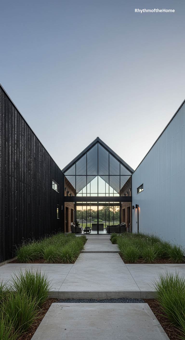 This unique barndominium features a breathtaking central pavilion made almost entirely of glass. This transparent breezeway connects two more solid, barn-like wings, one with black siding and one with light grey. The glass section, with its A-frame roofline, creates a stunning architectural feature that blurs the lines between indoors and out, offering unobstructed views through the home to the landscape beyond. A simple concrete path leads through a bed of ornamental grasses to this incredible entrance, showcasing a design that is both daringly modern and elegantly simple.