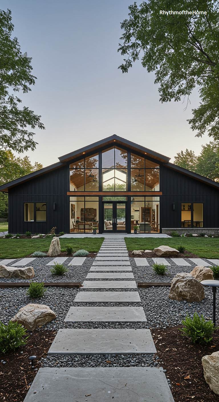 This barndominium takes the traditional barn form and gives it a spectacular modern twist. The structure has a classic barn silhouette with black vertical siding, but the entire back wall has been replaced with a two-story expanse of glass. This incredible feature opens up the interior living space to the outdoors, flooding it with light and connecting it to the beautifully landscaped yard. A walkway of concrete pavers set in a bed of smooth river stones leads to the entrance, enhancing the home’s blend of natural and modern elements.