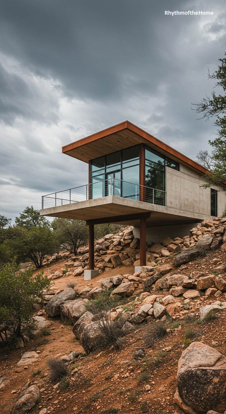 This barndominium is a feat of modern engineering and design, perched dramatically on a rocky hillside. The main living space is a concrete and glass box that is cantilevered out from the slope, appearing to float above the rugged terrain. Supported by sturdy pillars, the structure features a wall of floor-to-ceiling windows to take full advantage of the stunning panoramic views. A simple balcony with a metal railing wraps around the cantilevered section. This is a bold and breathtaking home that offers a truly unique living experience in complete harmony with its challenging and beautiful site.