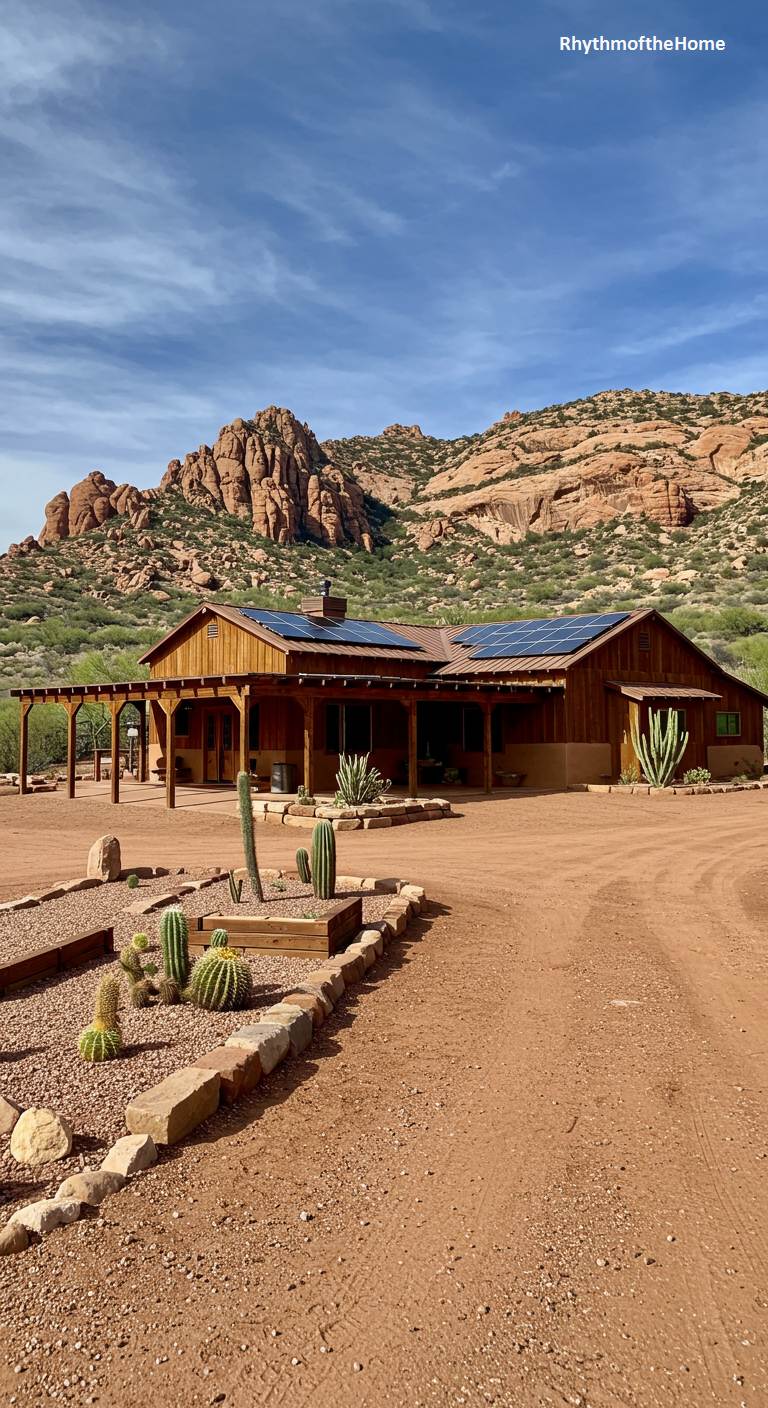 This ranch-style barndominium is a harmonious desert dwelling, perfectly adapted to its arid environment. The warm-toned wood siding and expansive covered porch offer shelter from the sun, while a rooftop solar panel array signals a commitment to sustainable living. The landscaping features native desert plants, including various species of cacti and succulents, thoughtfully arranged within rock and gravel beds. Set against a backdrop of stunning red rock formations under a brilliant blue sky, this home is a true oasis, offering modern comfort while celebrating the rugged beauty of the desert landscape.