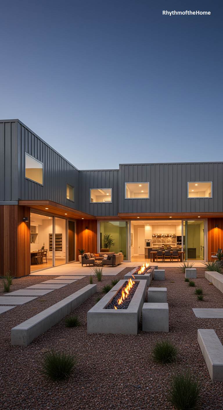 This U-shaped barndominium is designed around a central courtyard that serves as the heart of the home. The exterior is clad in a combination of industrial-style metal siding and warm wood accents. Large sliding glass doors open from multiple rooms onto the courtyard, creating a seamless indoor-outdoor flow. The courtyard itself is a masterpiece of modern landscape design, featuring a long, linear fire pit, concrete benches, and gravel beds. It’s a private, stylish, and functional outdoor room, perfect for entertaining and enjoying the clear evening sky.