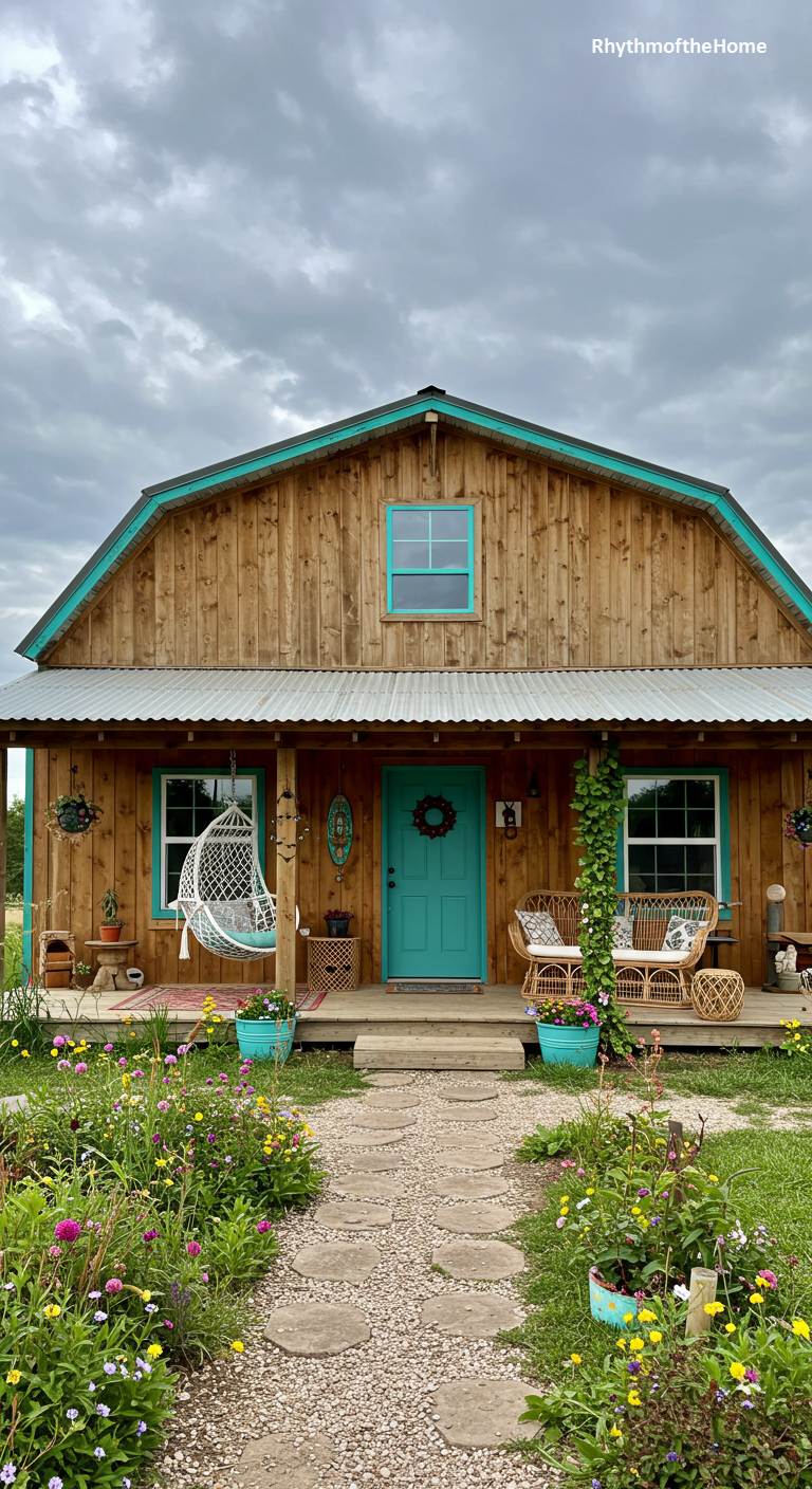 This barndominium radiates a cheerful, bohemian, and eclectic charm. The natural wood siding of the gambrel-roofed barn is accented with a vibrant turquoise front door and window trim. The cozy front porch is decorated with a hanging wicker chair, rattan furniture, and colorful potted plants, creating a relaxed and inviting atmosphere. A simple stone and gravel path winds through a wildflower garden to the front steps. This home is a beautiful expression of a free-spirited, artistic lifestyle, filled with personality and warmth.