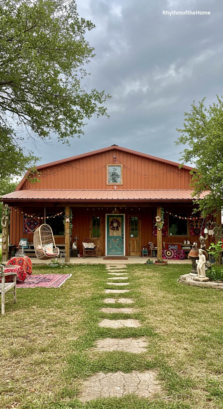 This barndominium is a vibrant and eclectic oasis, bursting with personality and artistic flair. The terracotta-colored metal siding and roof provide a warm backdrop for a wealth of bohemian-style decorations. The full-length front porch is adorned with colorful rugs, a hanging wicker chair, string lights, and various unique artifacts. The landscaping is relaxed and natural, with a simple stepping-stone path leading to the turquoise front door. This is a home that tells a story, reflecting a creative and free-spirited approach to life and design.