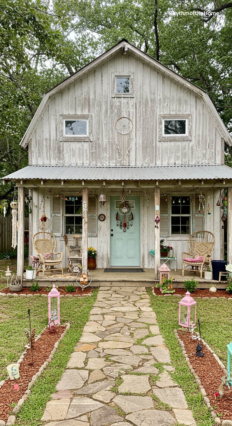 This barndominium is a beautiful example of a light and airy bohemian style. The whitewashed, distressed siding gives it a rustic, beachy feel, which is complemented by a simple corrugated metal roof. The front porch is a treasure trove of boho-chic decor, including wicker chairs, macrame wall hangings, dreamcatchers, and lanterns. A pale mint green door adds a soft touch of color. The stone walkway is bordered by neatly edged garden beds, adding a bit of order to the otherwise free-spirited design. This home is a dreamy and whimsical retreat.