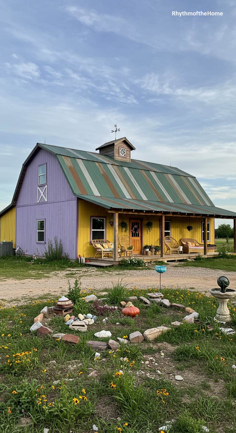 This barndominium is a joyful and whimsical expression of color. The structure itself is painted in a daring combination of bright yellow and lavender purple, immediately catching the eye and sparking a smile. The corrugated metal roof has a unique green and rust patina. The front porch features wicker chairs and simple decorations, while a rock garden in the foreground adds a touch of rustic landscaping. This is a home that isn’t afraid to be different, celebrating individuality and the playful use of color in a country setting.