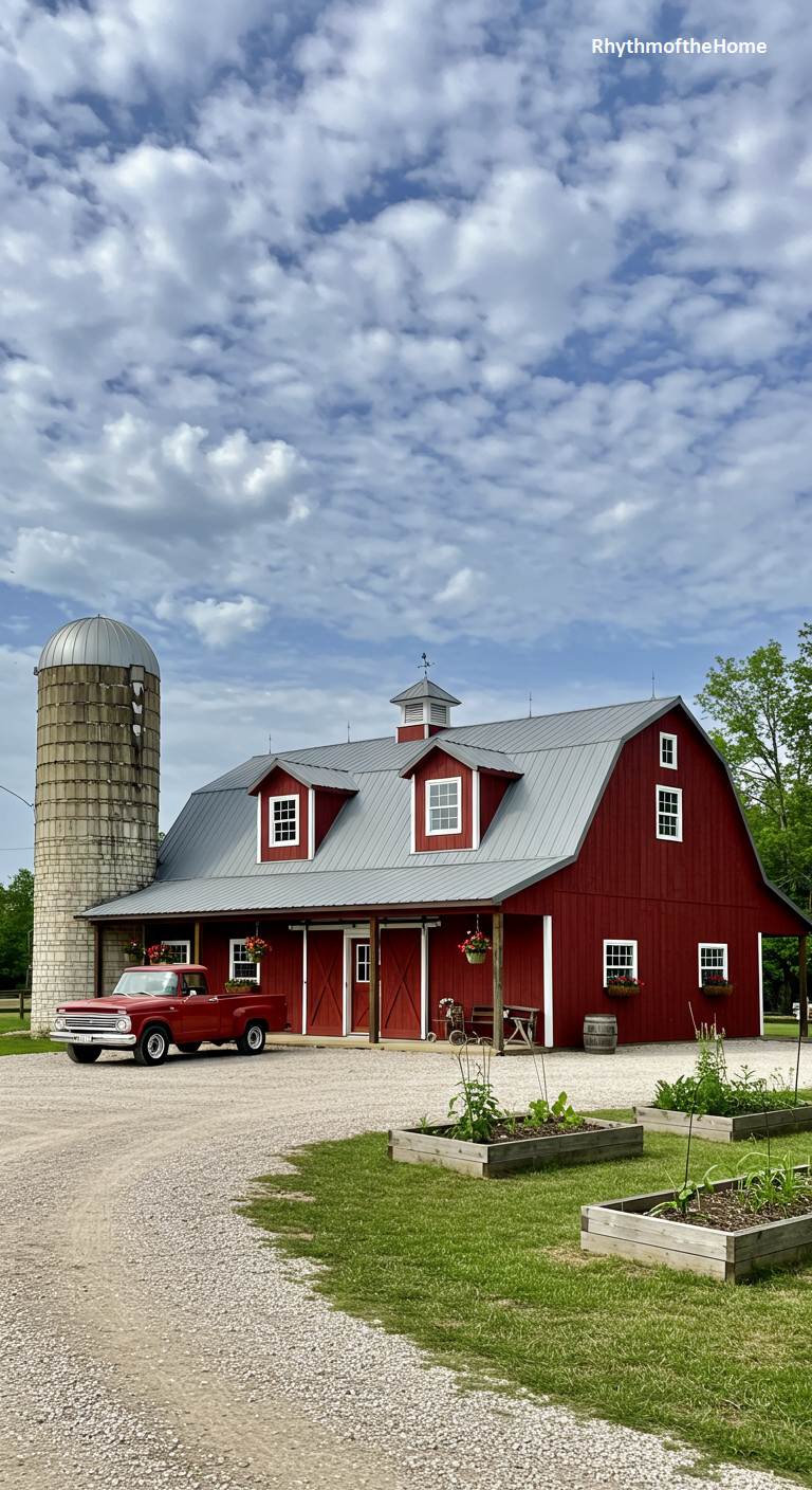 This property is a loving tribute to American agricultural heritage, reimagined for modern life. The barndominium itself is a classic red barn with a contrasting grey metal roof, complete with traditional dormers and white trim. Standing proudly beside it is a weathered concrete silo, a nostalgic nod to the farm’s past. A vintage red pickup truck is parked in the gravel drive, adding to the authentic charm. In the foreground, neat raised garden beds are ready for planting, completing this idyllic picture of wholesome country living where history and home are beautifully intertwined.