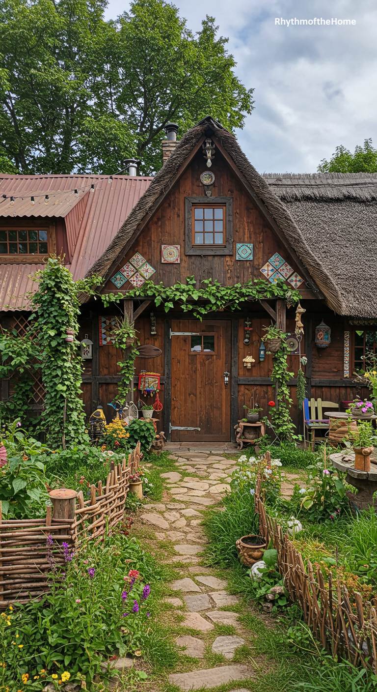 This charming wooden barndominium looks like a fairytale cottage come to life. The dark wood exterior is adorned with colorful painted tiles and climbing green vines. A thatched roof section over the porch and a wattle fence add to its old-world, rustic charm. The front garden is a riot of flowers and plants, creating a lush and magical entrance. This home is a masterpiece of whimsical and artistic craftsmanship, overflowing with unique details and a sense of storybook enchantment that transports you to another time and place.