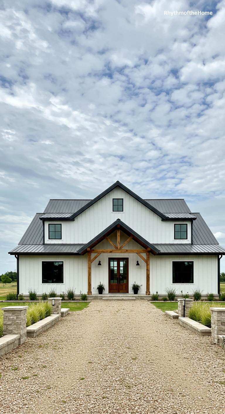 This barndominium is a pristine example of modern farmhouse architecture, showcasing perfect symmetry and a clean color palette. The brilliant white vertical siding is sharply defined by the dark metal roof and black window frames. A timber-framed gabled entryway with a natural wood-toned double door sits at the exact center, creating a welcoming focal point. The gravel driveway leads directly to the entrance, flanked by low stone pillars and beds of ornamental grass, reinforcing the home’s balanced and elegant design under a vast, cloudy sky.