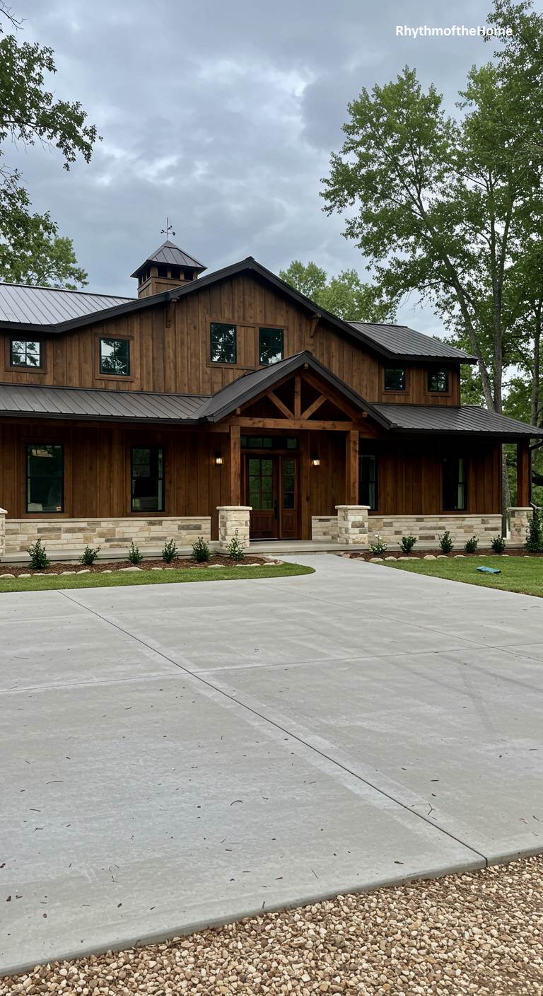 This barndominium presents a handsome and substantial appearance, combining the warmth of wood with the solidity of stone. The dark-stained vertical wood siding is beautifully complemented by a lighter-toned stone wainscoting that wraps around the base of the home and the porch pillars. A timber-framed entryway adds another layer of rustic craftsmanship. The concrete driveway and walkway provide a clean, modern contrast to the natural materials of the house itself. This is a home that feels sturdy, well-built, and elegantly rooted in its green surroundings.