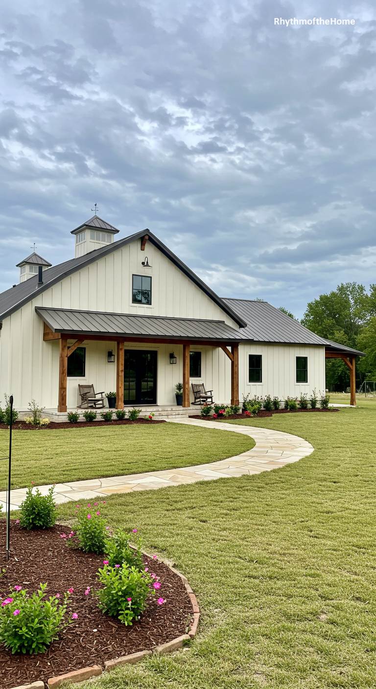 This barndominium expertly balances modern farmhouse aesthetics with practical family living. The off-white siding and dark metal roof are classic elements, while the prominent timber-framed entryway adds rustic character. The home features a two-car garage with bold black doors, providing ample space and a strong visual element. The landscaping is fresh and modern, with a mix of concrete and gravel paths, and curved garden beds filled with colorful flowers and mulch. A weathervane on the cupola adds a final, charming farmhouse touch.