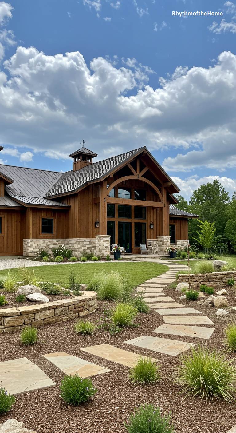 This magnificent barndominium is perfectly situated within a beautifully designed landscape. The warm wood siding and prominent timber-framed entrance create a grand, lodge-like feel. The approach to the home is a work of art, with a winding flagstone path traversing multiple levels of rock-walled terraces filled with ornamental grasses and shrubs. This thoughtful landscaping serves to ground the large structure in its environment, creating a harmonious and impressive transition from the natural surroundings to the stunningly crafted home.
