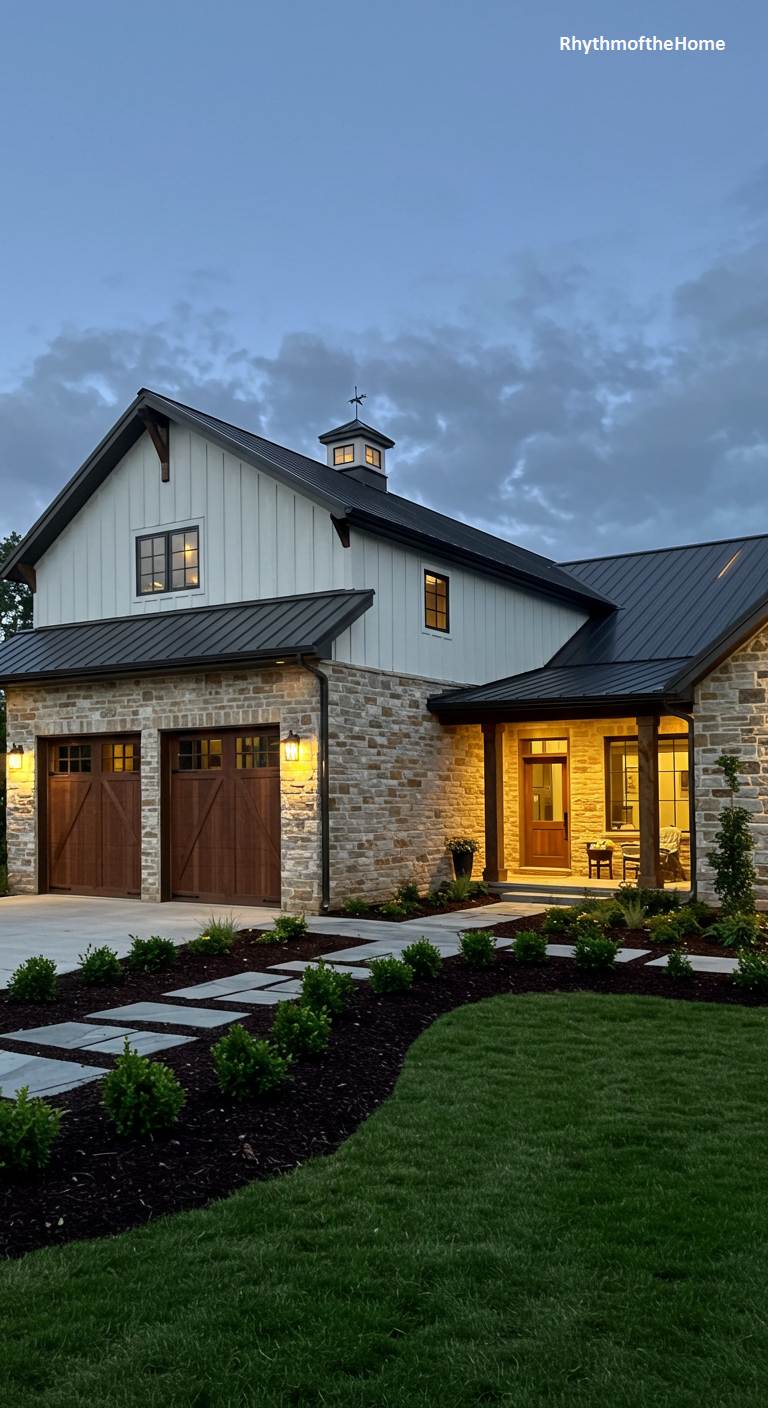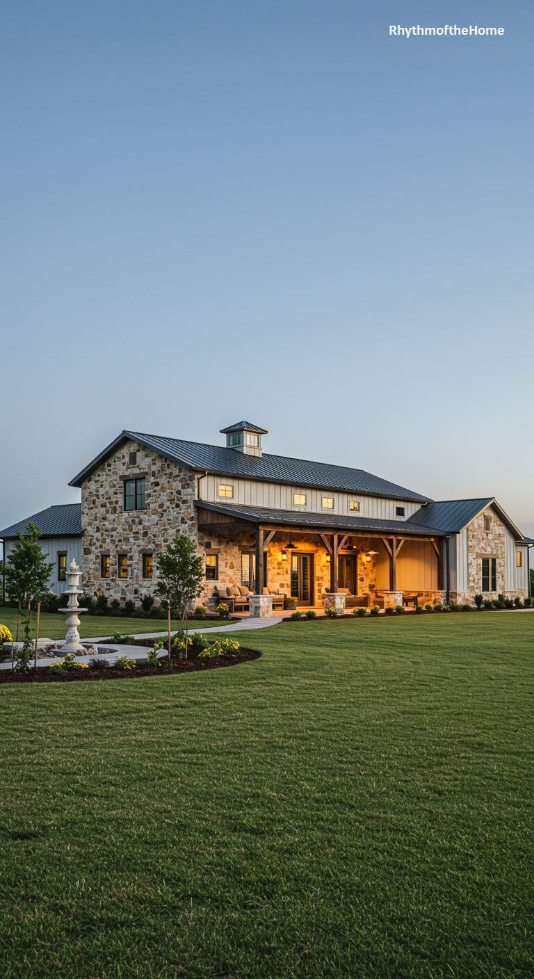 78. Stone and White Barndominium Home at Dusk