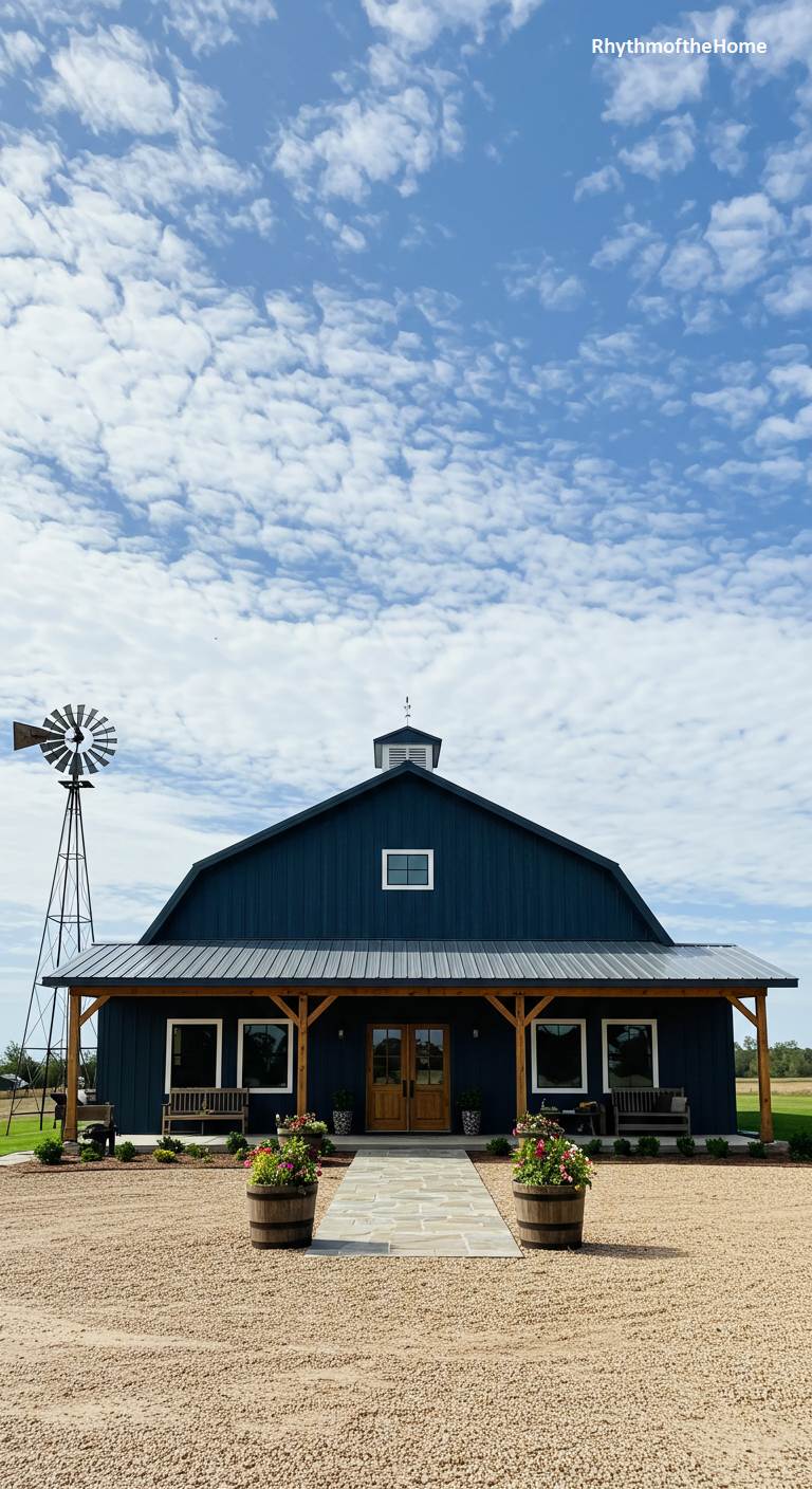 This barndominium puts a sophisticated and stylish spin on the classic barn silhouette. The exterior is painted a deep navy blue, a chic and modern alternative to traditional red, which pairs beautifully with the silver metal roof and white trim. A full-length covered porch offers ample space for outdoor seating, with two large wooden barrels used as planters adding a rustic touch. A windmill stands in the background, grounding the modern color scheme in a traditional country setting. This home is a perfect blend of classic form and contemporary style.