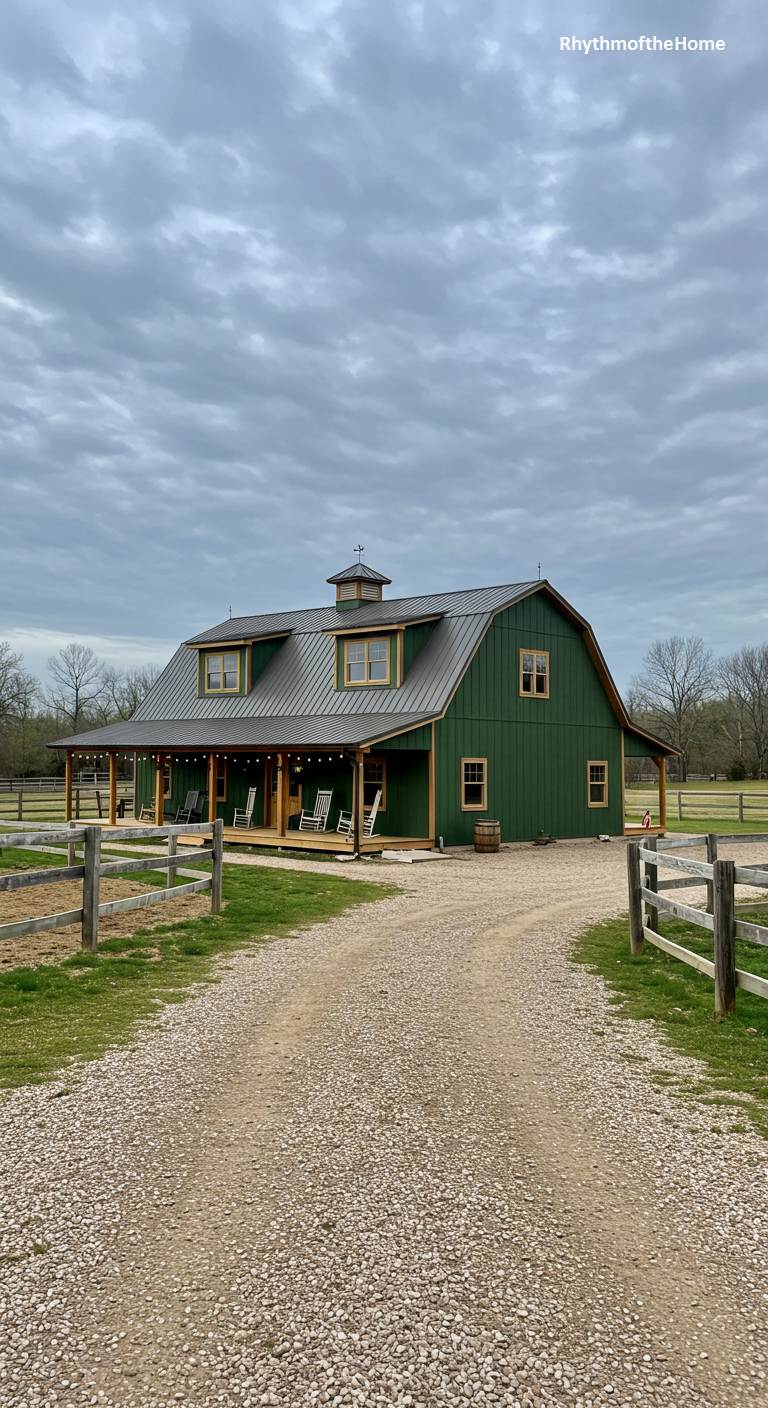 Nestled in a peaceful, wooded setting, this barndominium is painted a lovely forest green that helps it merge with its natural surroundings. The dark green siding is complemented by natural wood trim around the windows and on the porch posts. The gambrel-style roof is clad in dark metal. A full covered porch is furnished with classic white rocking chairs, inviting quiet moments of relaxation. A simple split-rail fence encloses the gravel yard, completing the picture of a tranquil and charming country retreat.