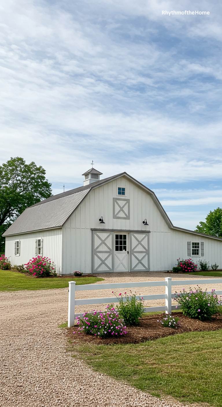 This pretty barndominium presents a soft and elegant take on the farmhouse style. The exterior is a clean, classic white, but the traditional barn doors and shutters are painted a gentle gray, creating a subtle and sophisticated contrast. A white picket fence encloses the front yard, which is beautifully landscaped with beds of vibrant pink roses. The gambrel roof and simple light fixtures add to its timeless charm. This is a bright, cheerful, and impeccably maintained home that exudes a sense of grace and pastoral beauty.