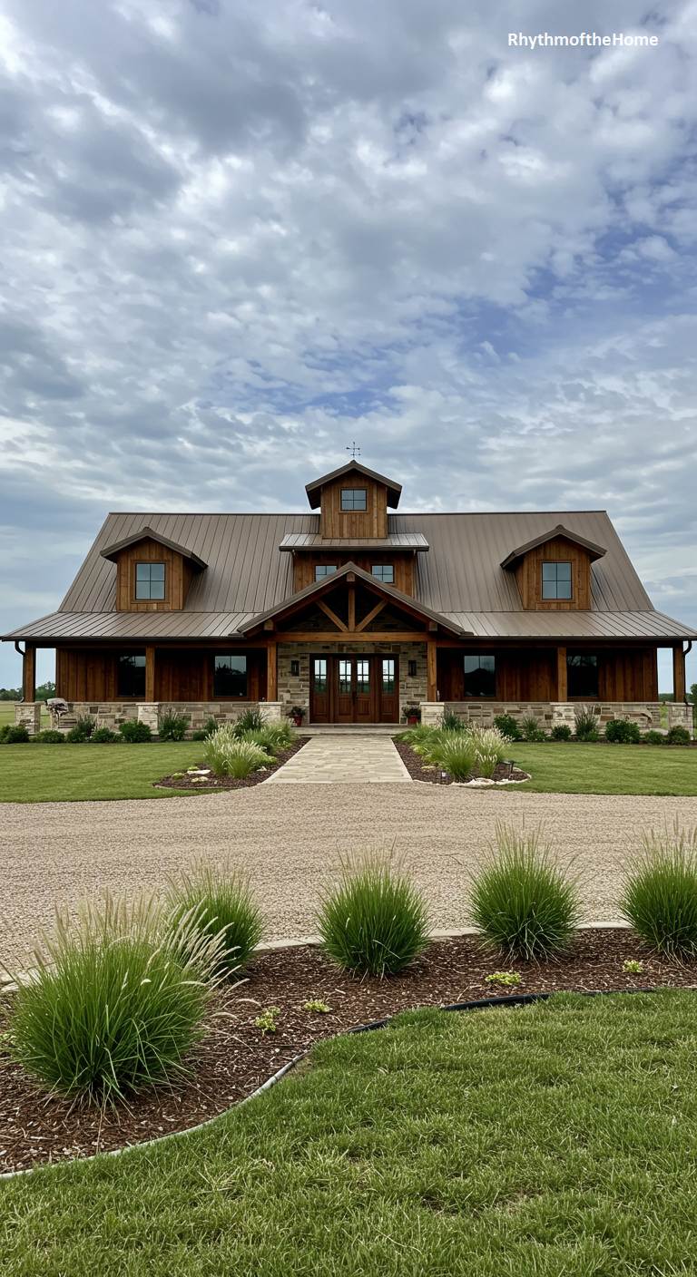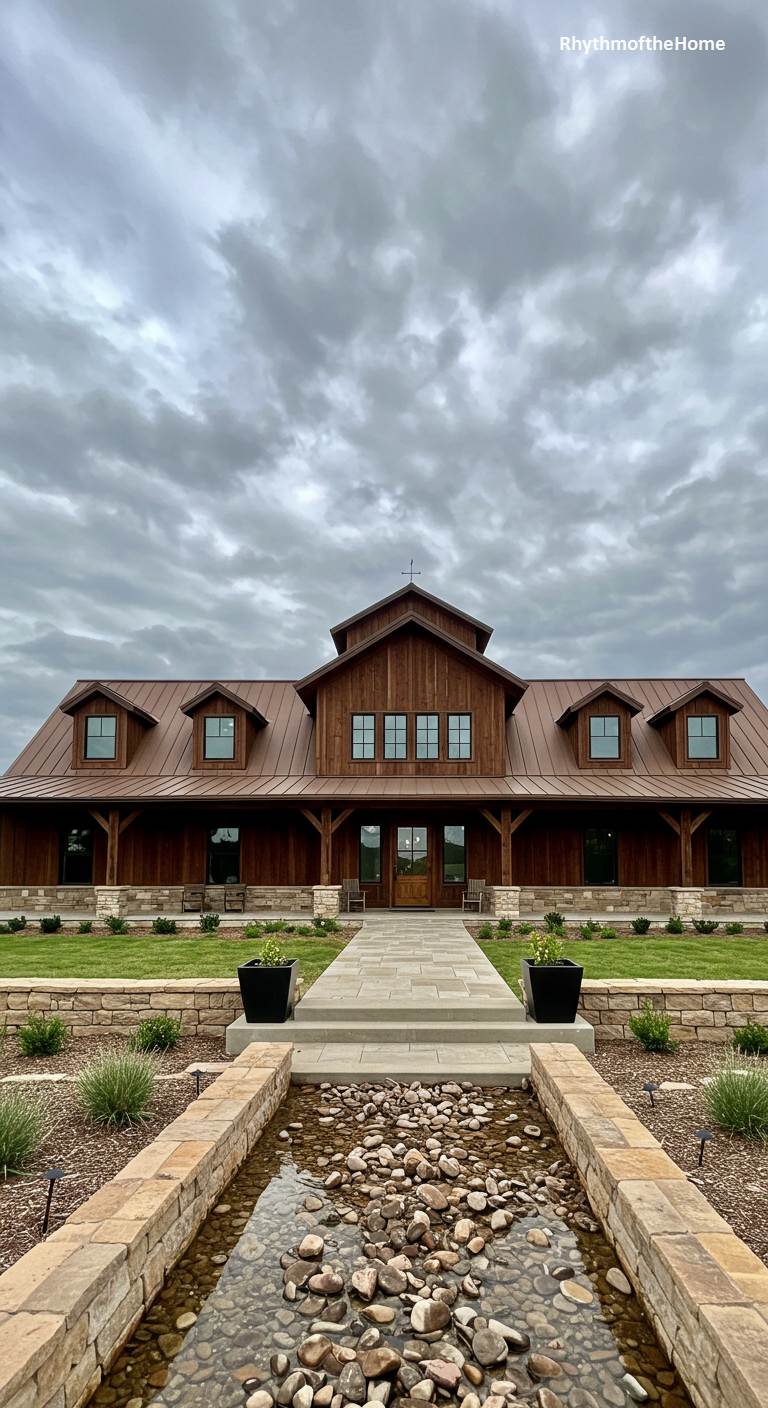 This magnificent barndominium boasts a commanding presence and an elegant, thoughtful design. The warm wood siding and brown metal roof give it a rich, natural feel. The approach is particularly grand, featuring a long, straight walkway flanked by low stone walls. This channel leads to a small, serene water feature filled with river rocks right before the entrance, creating a tranquil and impressive welcome. With its symmetrical design and multiple dormers, this home feels like a luxurious country estate, perfectly blending rustic materials with sophisticated landscape architecture.