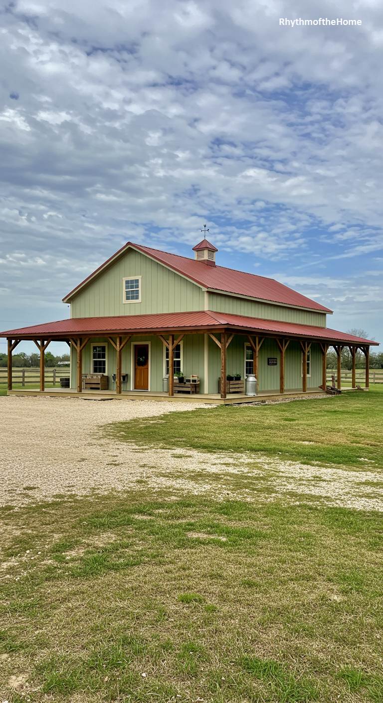 This charming barndominium features a unique and pleasing color combination. The siding is a soft, earthy sage green, which is beautifully topped by a contrasting red metal roof. A full wraparound porch, supported by sturdy wooden posts, provides ample sheltered outdoor living space. The home is situated in a wide-open, grassy lot, giving it a classic ranch feel. This is a friendly and approachable design, with a color palette that feels both distinctive and harmonious with a rural landscape.