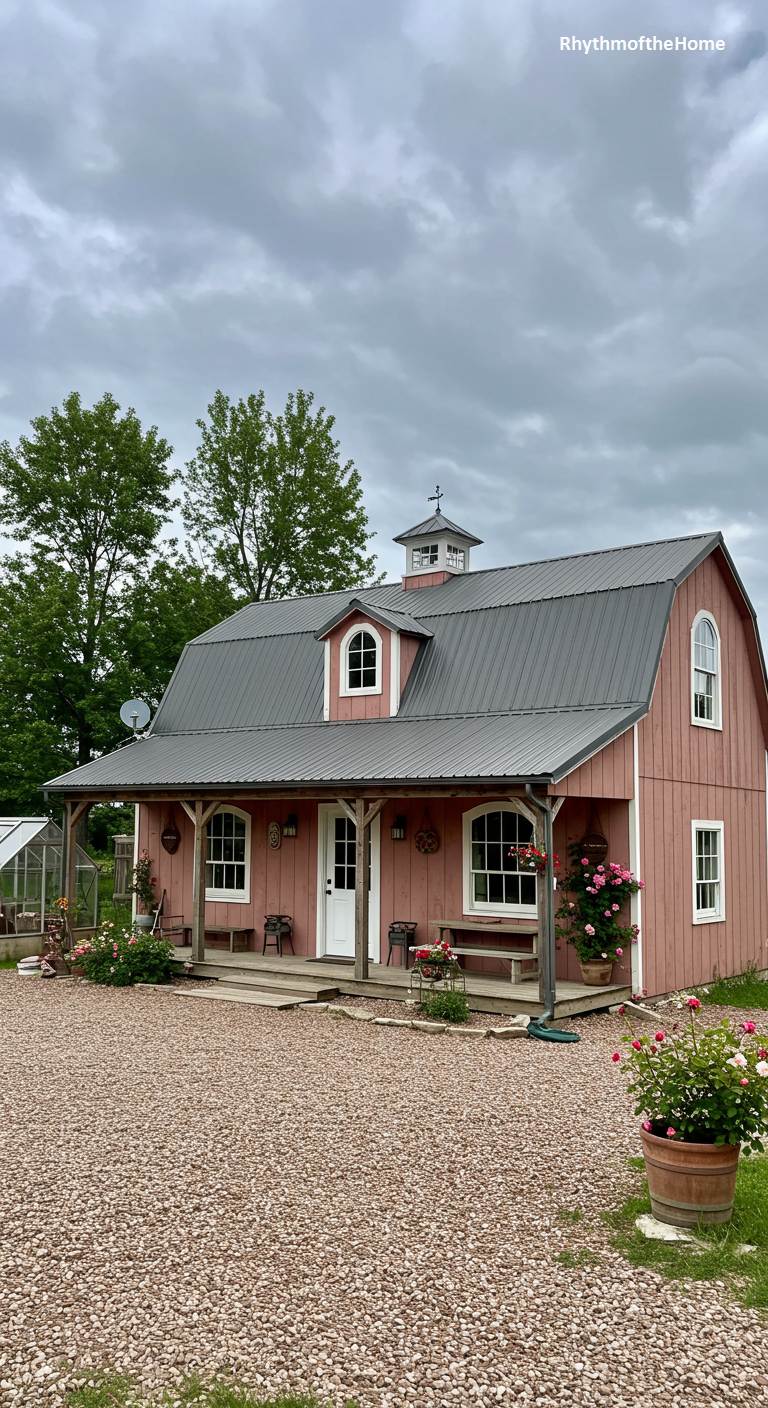This barndominium is full of sweet, cottage-like charm. It’s painted a lovely dusty rose color, which gives the traditional barn shape a soft and romantic feel. The dark metal roof and white trim on the windows and door provide a nice contrast. A small front porch offers a welcoming entry, and the yard is planted with beautiful rose bushes in full bloom, perfectly complementing the color of the house. A small greenhouse is visible in the background, suggesting a love for gardening. This is a unique and delightful home with a warm and inviting personality.