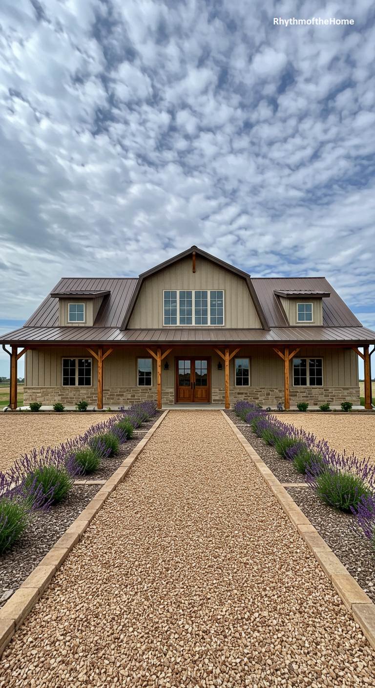 This beautiful barndominium appears to be situated on a lavender farm, with long, fragrant rows of purple flowers lining the gravel path to the entrance. The house itself has a soft, neutral tan siding and a brown metal roof, allowing the vibrant landscape to take center stage. The porch is supported by rustic wooden posts, and a stone wainscoting adds texture and a sense of solidity to the base. This home creates a picturesque and sensory experience, blending the beauty of a working farm with comfortable and stylish residential design.