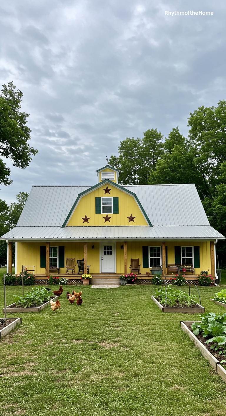 This barndominium is a beacon of cheerfulness, painted a bright and sunny yellow. The traditional gambrel roof is a classic silver metal, and the front gable is accented with three decorative stars, adding a touch of patriotic folk art charm. A full front porch is equipped with rocking chairs, perfect for enjoying the view of the surrounding garden. The front yard is dedicated to neat, raised garden beds, brimming with healthy green plants. This is a happy, vibrant home that radiates warmth and a love for gardening and country living.