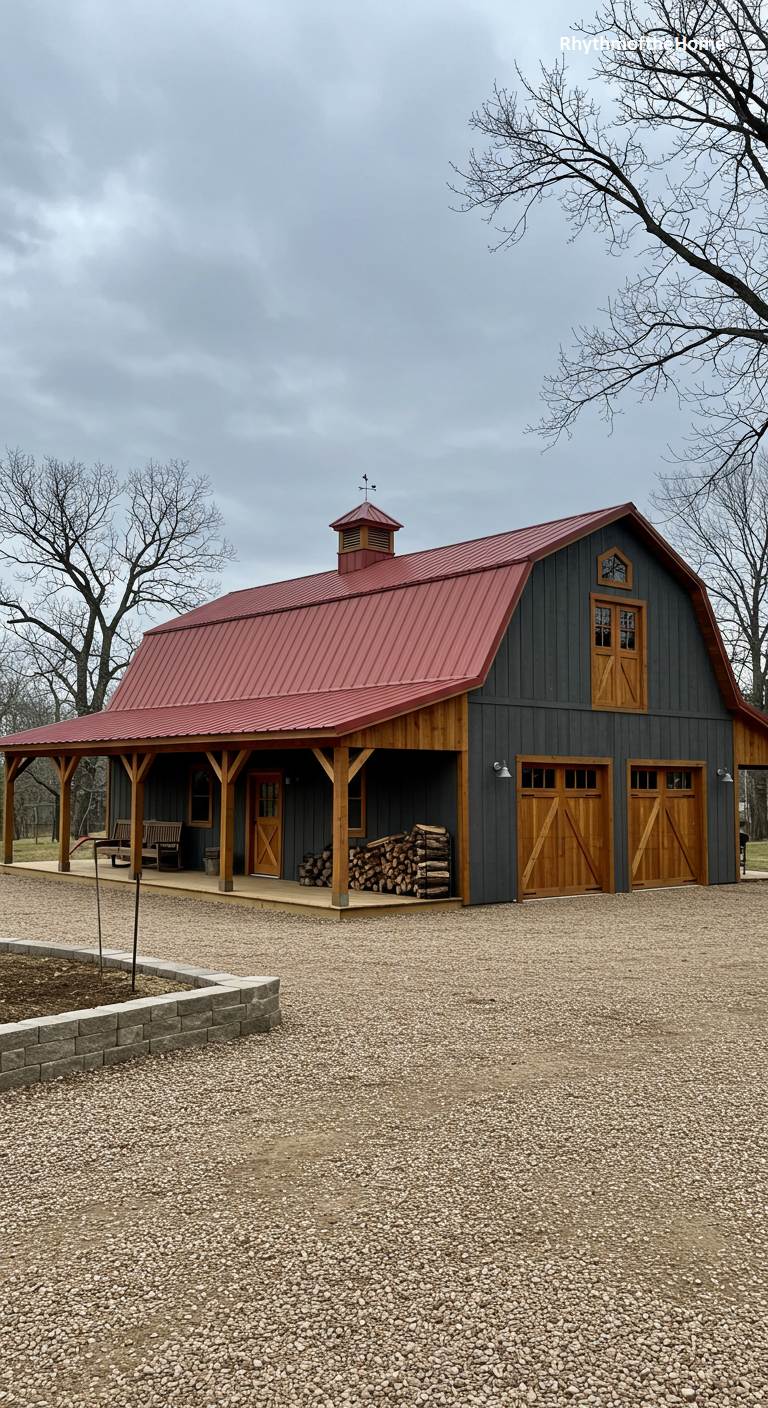 This handsome barndominium showcases a stylish and contemporary color palette. The main body is clad in a dark charcoal gray siding, which is powerfully accented by a bold red metal roof. The warmth of natural wood is used for the garage doors, front door, and the sturdy posts of the L-shaped porch. A neatly stacked pile of firewood on the porch adds a practical and rustic touch. The gravel driveway and simple landscaping give the property a clean, modern feel, resulting in a design that is both rugged and highly stylish.